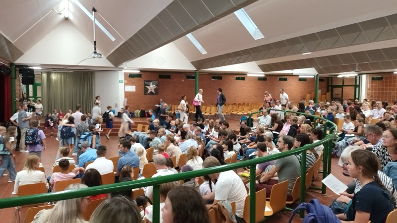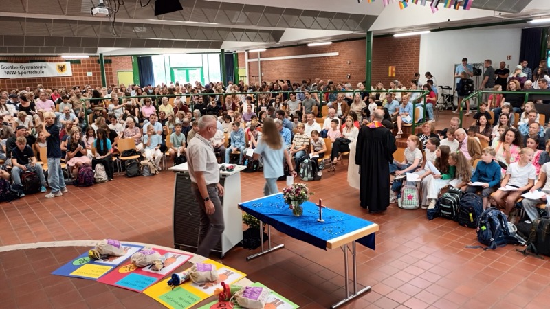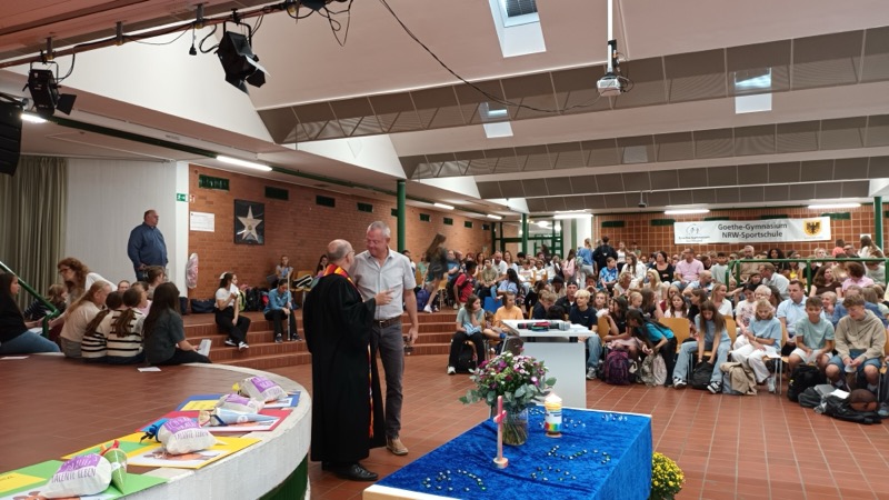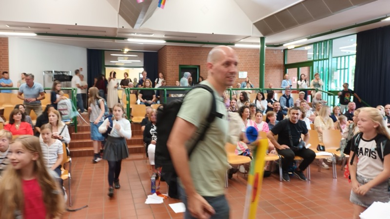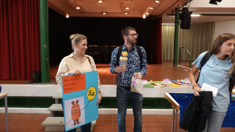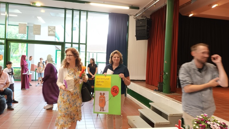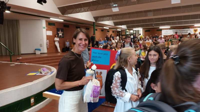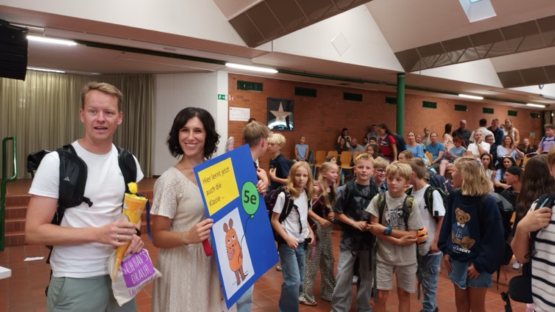 150 Kinder des neuen 5. Jahrgangs kamen mit ihren Familien zur Einschulungsfeier in unsere Aula. Die Stimmung war sehr gut. Lehrerinnen, Lehrer und die UNICEF-AG haben leckere Muffins, Kuchen, Kaffee und kalte Getränke angeboten.